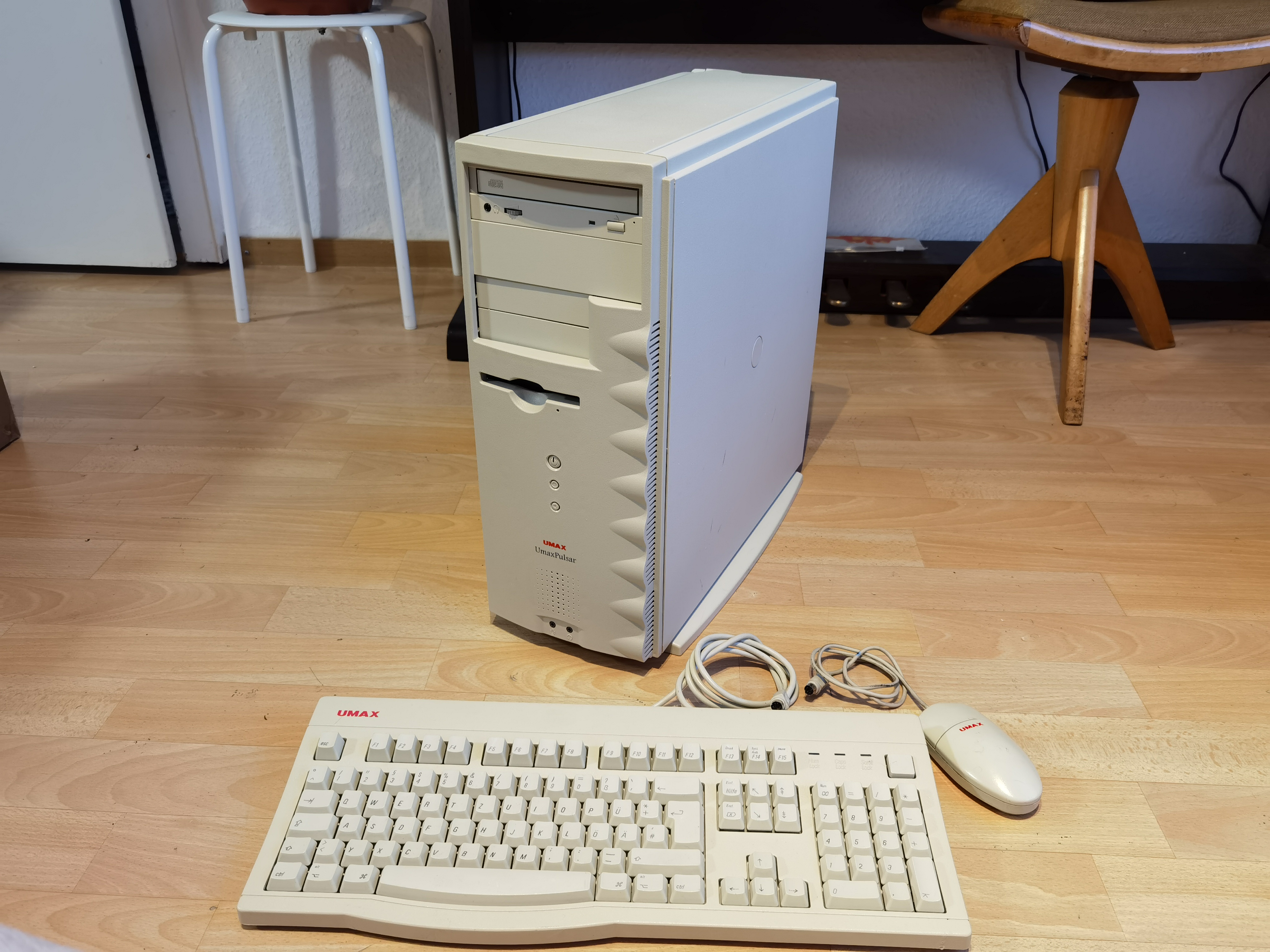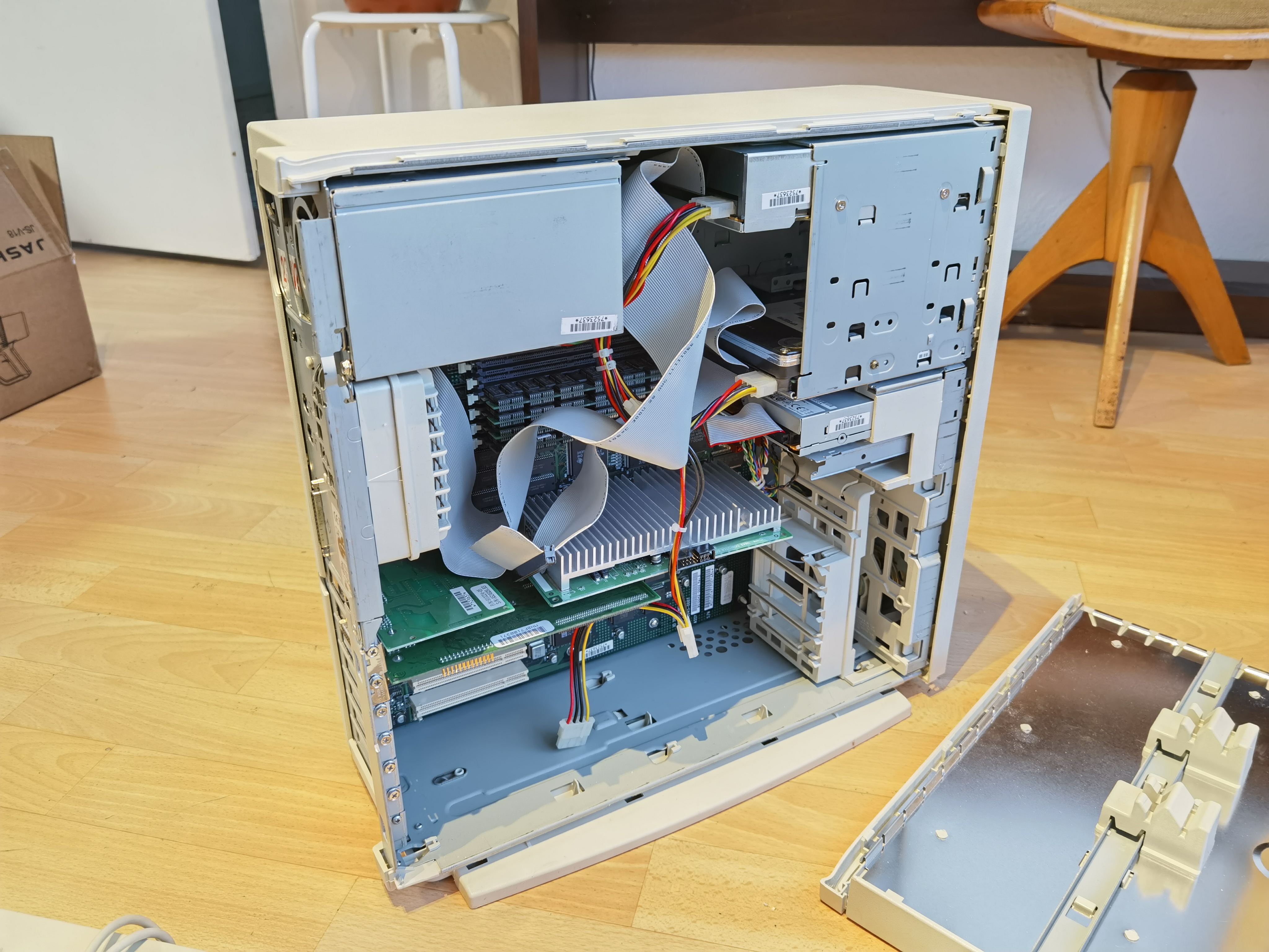 Habe den Gleichen, allerdings mit der Laufwerkstür. Aufgrüstet mit einer G4 / 450 MHz Karte und SATA Laufwerken. Ja das geht, entweder mittels FW Karte mit internem Anschluß oder mit einer dedizierten SATA Karte mit geflaschtem BIOS und einer ATI Radeon 7000. Ich verwende den regelmäßig, da auf meinem ein gutes e-CAD/ESD Programm drauf ist. Auch habe ich die "Düsenjet"-Lüfter getauscht.